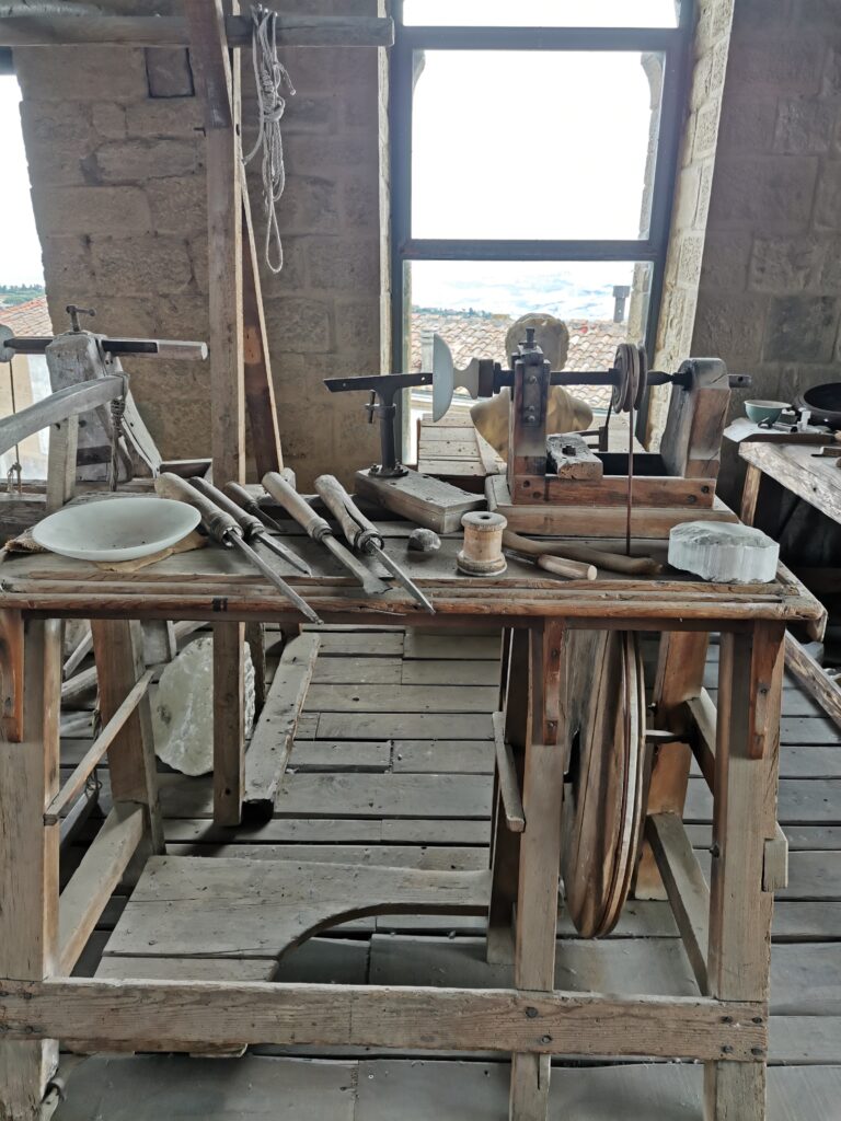 Un viaggio a ritroso nel tempo, nella storia della preziosa pietra e della comunità di Volterra: estrazione, lavorazione, commercializzazione – dagli etruschi ai giorni nostri – tratteggiati e allestiti nella casa-torre medievale Minucci.